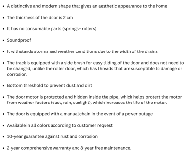 Safwat Al-Zahraa Company offers sliding slide doors according to the American system with a thickness of approximately 5 cm. They are doors made of slides insulated with a high-quality insulating material to resist weather conditions and humidity. They are of various shapes, colors and sizes. They are European-made and are operated by remote control or internal key and can be opened manually in the event of a power outage. They are used These doors are for villas and palaces, and there are special models for all warehouses, such as general warehouses, pharmaceutical warehouses, refrigeration warehouses, and others.