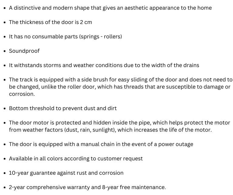 These doors are made of iron mixed with aluminum and are coated with a rust-resistant layer with a thickness of 0.5 mm and in various sizes, up to a width of 5.80 meters and a height of 6 meters.